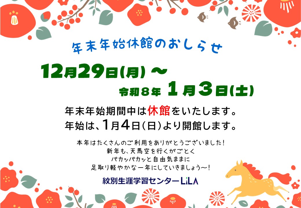 紋別生涯学習センターLiLAでは、下記期間を年末年始休館といたします。